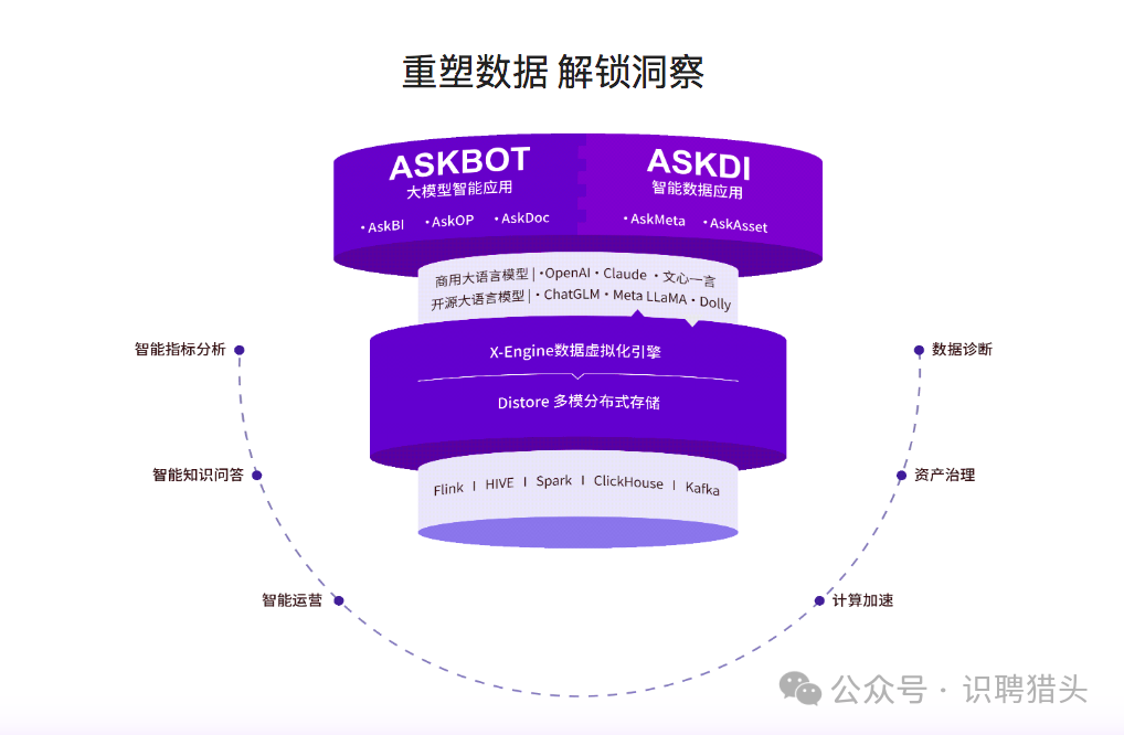 看下图,是数巅科技官网的一幅图,第一层ASKBOT、ASKDI是两块应用级产品,卖给客户使用;第二层是各家大模型;下边基层其实是一般性大数据平台用到的一些基建。