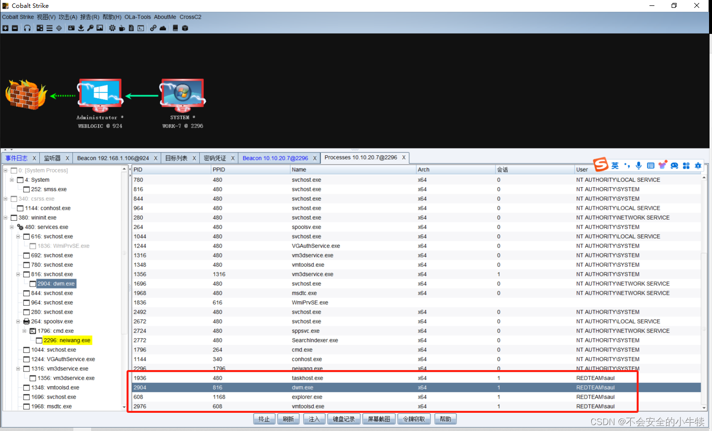 现在被控主机为system权限,因此我们查看进程,借用进程注入,生成一个域用户权限的会话,