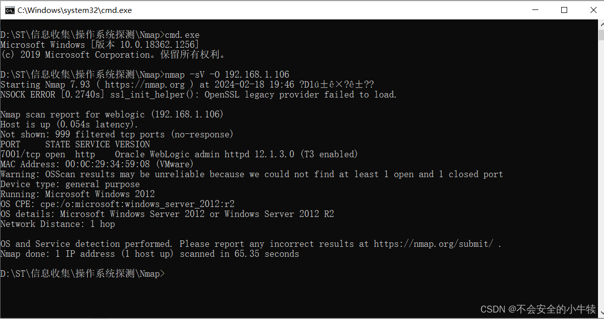 使用工具nmap对目标192.168.1.106进行端口扫描,命令为 nmap -sV -O 192.168.1.106,通过端口扫描发现目标网站开放7001端口,