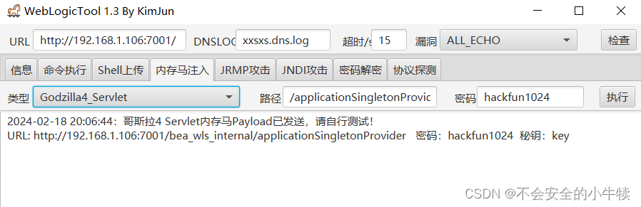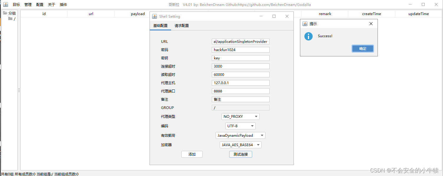 使用webshell管理工具哥斯拉进行连接,输入地址&密码&秘钥,成功链接。