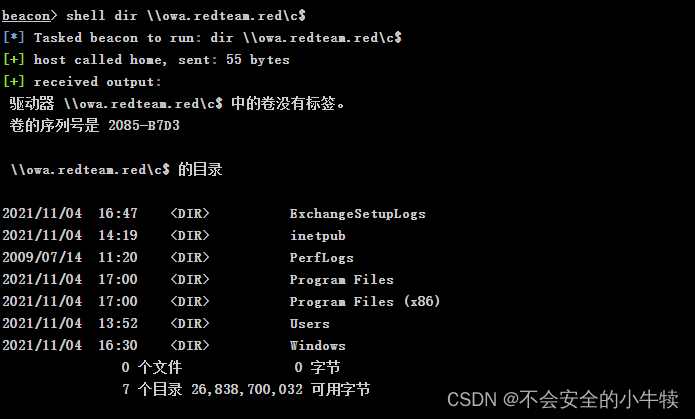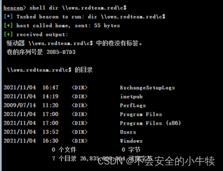 使用命令dir \\\\owa.redteam.red\\c$对域控进行连接: