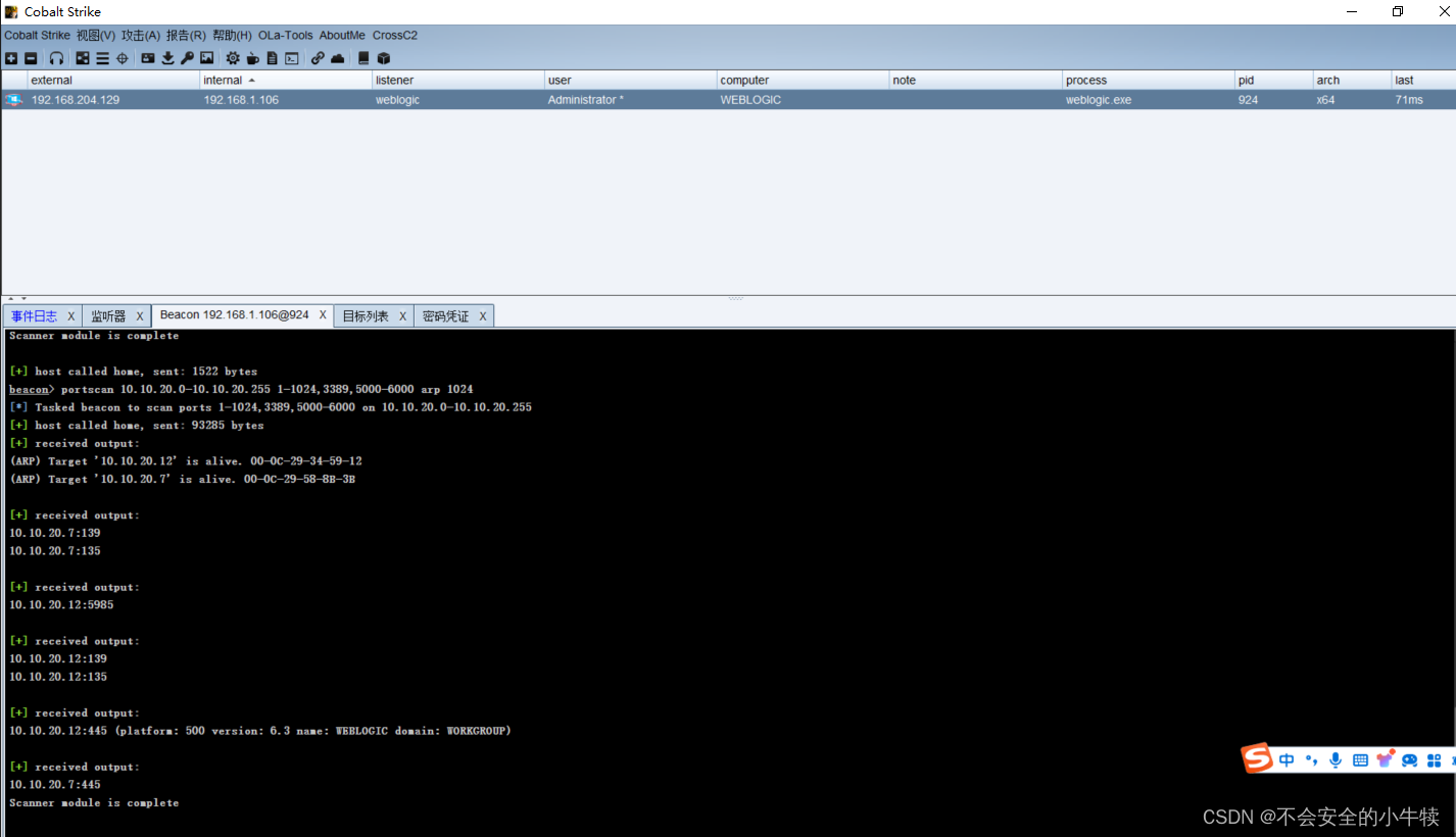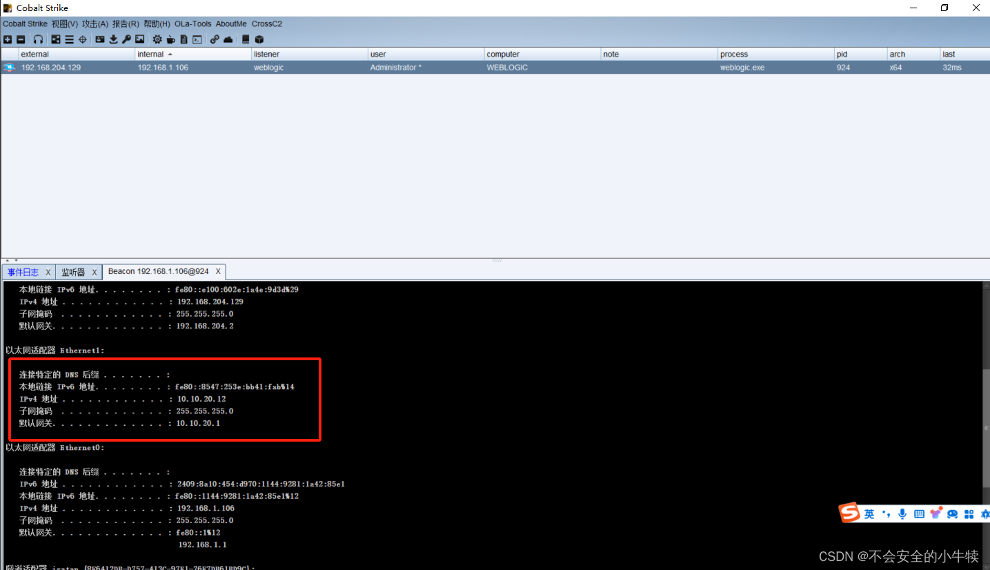 对10.10.20.12进行渗透,使用cs进行socks代理,