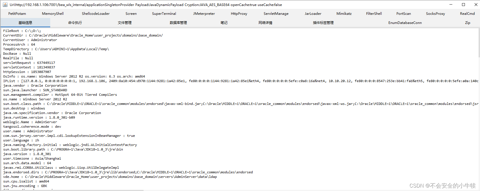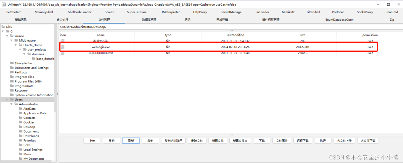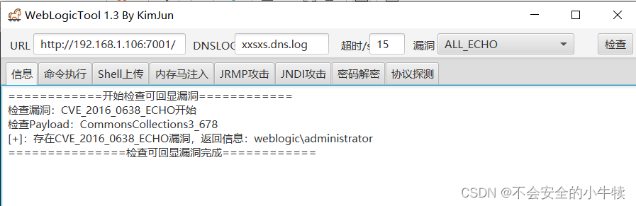 通过前期的信息收集发现该环境使用的是weblogic框架,使用WeblogicTool\_1.3.jar漏洞检测工具对目标网站进行检测,发现存在CVE\_2016\_0638\_ECHO漏洞,且为administrator权限。