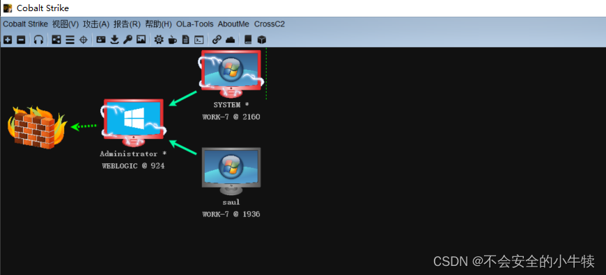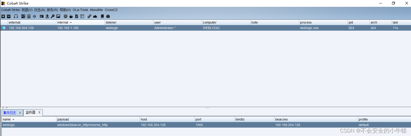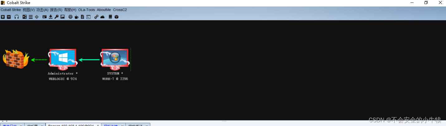 因为该主机处于内网,无法进行将会话派送至cs上,因此我们利用cs的转发上线,将后门上传至主机。