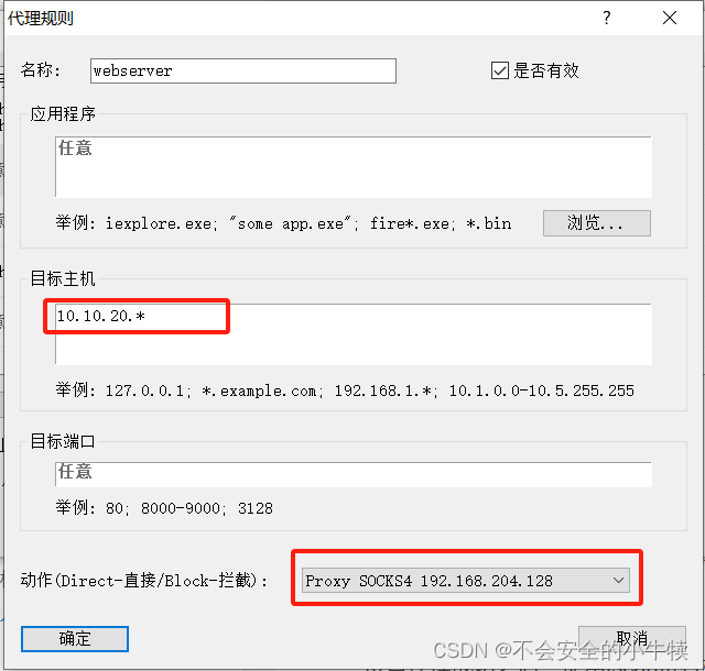 设置规则:由前期信息收集得到目标主机位于10.10.20.1/24的网段,IP为10.10.20.7,
