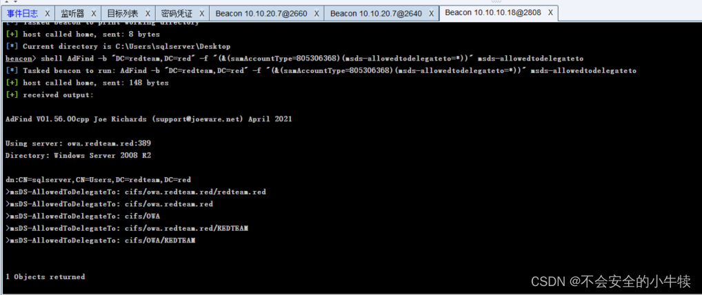 执行命令:AdFind -b "DC=redteam,DC=red" -f "(&(samAccountType=805306368)(msds-allowedtodelegateto=\*))" msds-allowedtodelegateto