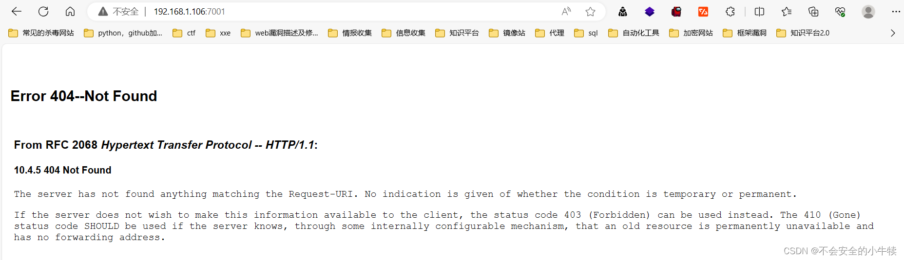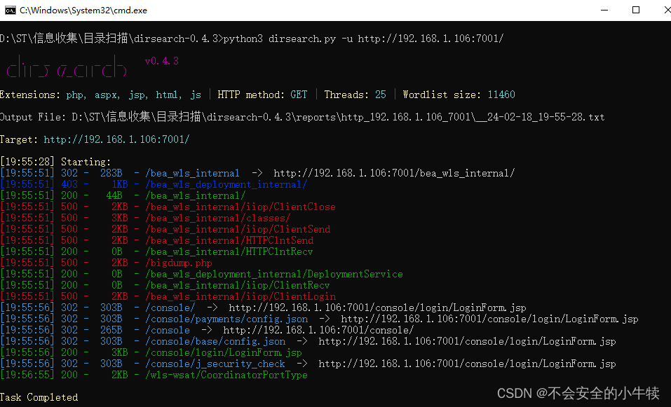 通过第一步的端口扫描发现该网站开放端口7001,进一步使用dirsearch工具进行目录扫描,命令为python3 dirsearch.py -u http://192.168.1.106:7001/