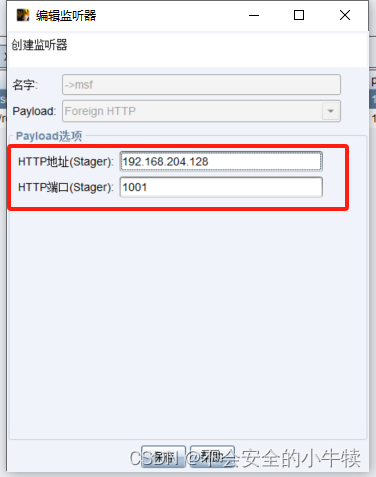 使用cs生成监听器,并进行会话派送,设置IP为msf的服务器IP,端口与msf设置监听端口一致,