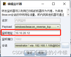 在进行监听器的创建时,要注意将监听地址设置为10.10.20.12(该地址与目标个人PC处于同一网段,可进行通信)
