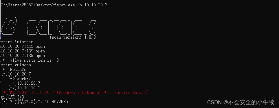设置代理成功之后,使用fscan进行检测,fscan.exe -h 10.10.20.7