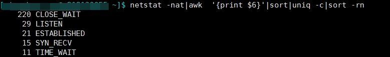 netstat -nat|awk '{print $6}'|sort|uniq -c|sort -rn #查看当前连接,注意close_wait偏高的情况,比如如下