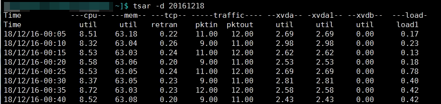 tsar -d 20161218###指定查看某天的数据,貌似最多只能看四个月的数据