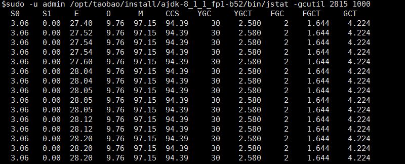 sudo -u admin /opt/xxx/install/ajdk-8_1_1_fp1-b52/bin/jstat -gcutil 28151000