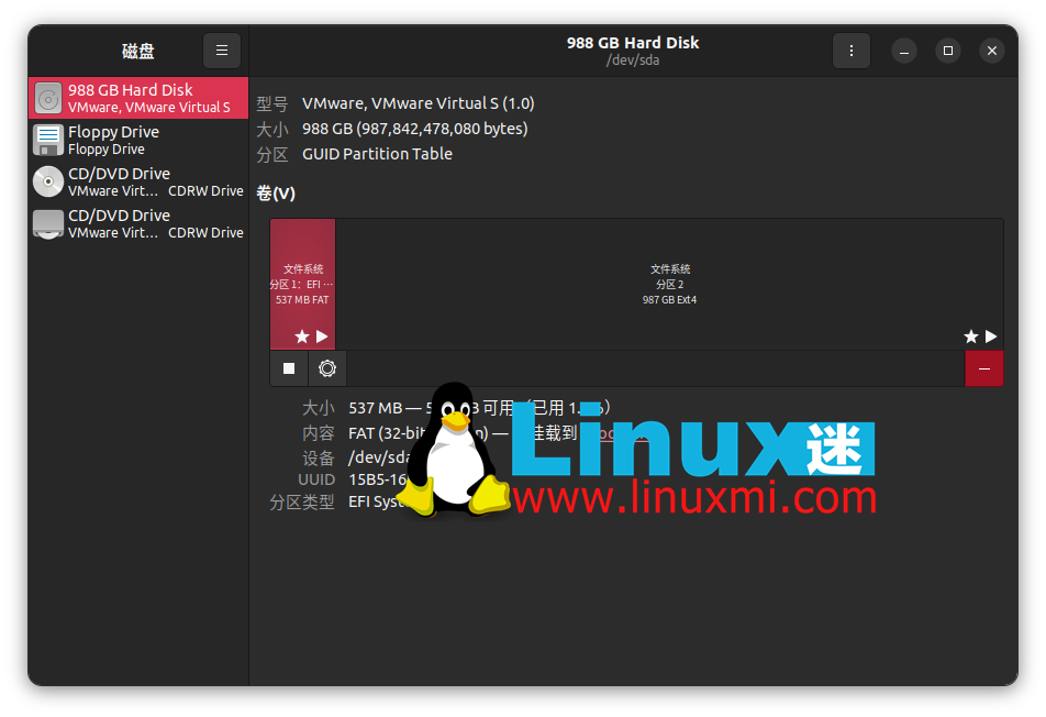 欢迎你使用你最喜欢的分区工具(例如 GParted)创建这些分区。如果你使用的是标准版本的 Ubuntu 或 Fedora,那么你很有可能已经安装了 GNOME 磁盘。或者,你可以选择使用命令行工具,例如 fdisk,无论你选择何种发行版,该工具都可用。