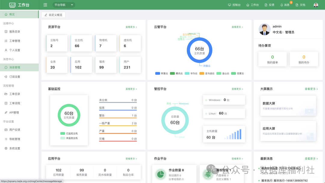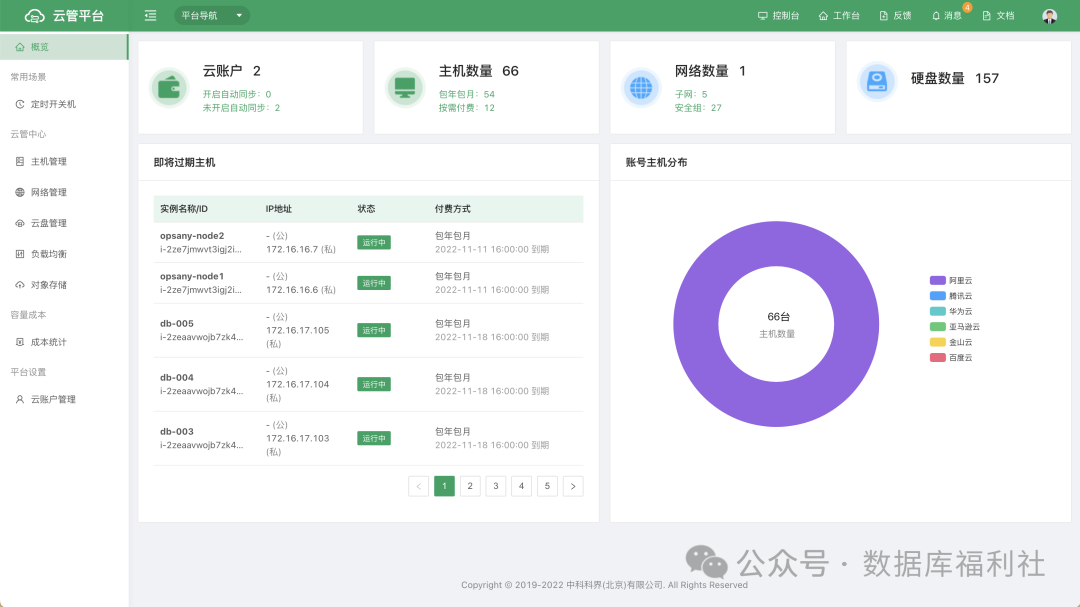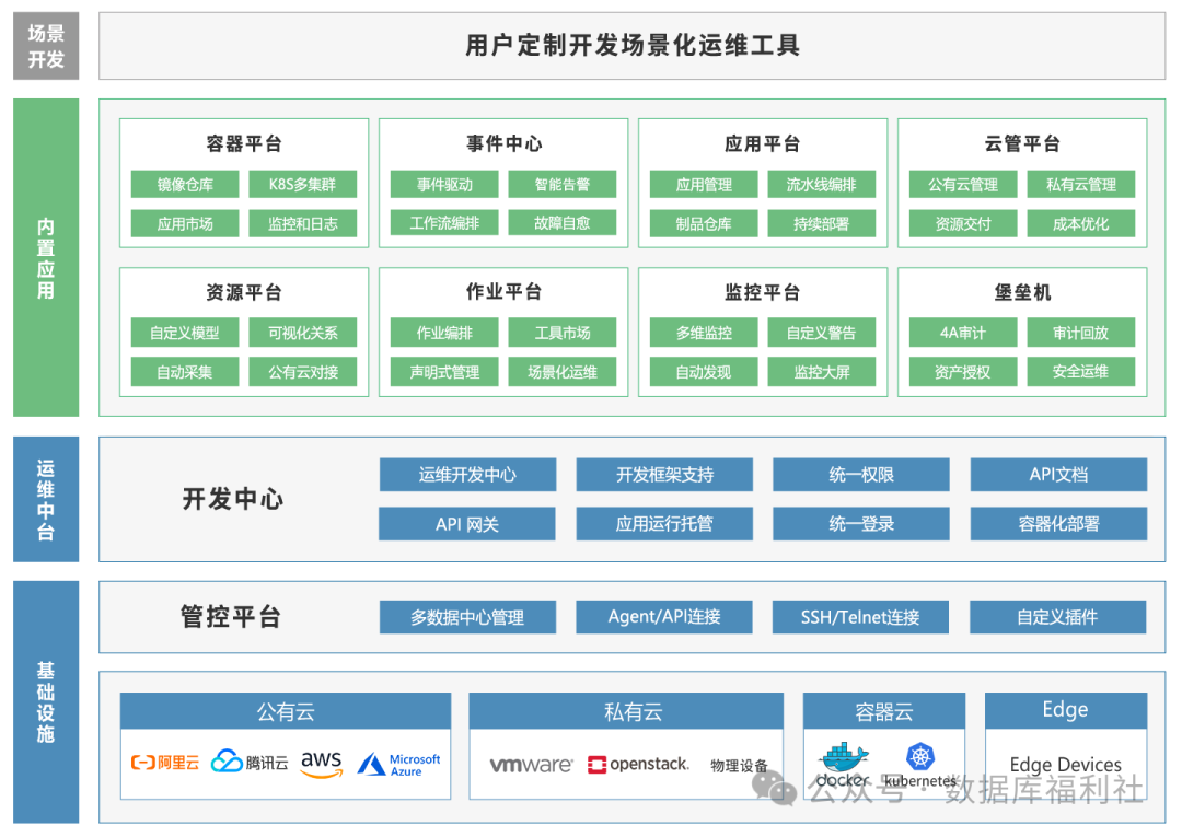 云管平台: 多云统一管理,支持阿里云、腾讯云、华为云、AWS、金山云,资产自动导入至CMDB(资源平台)。
