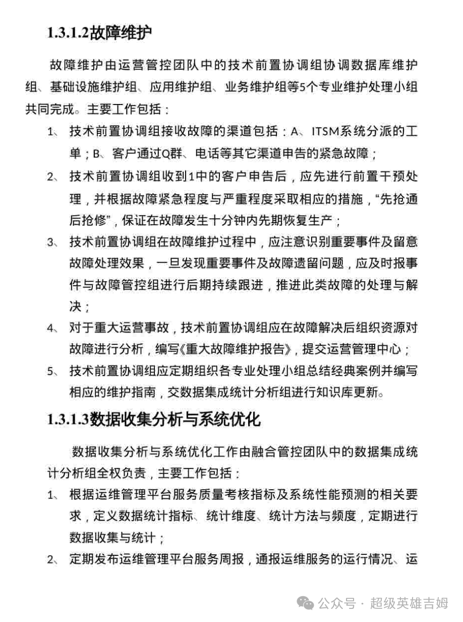 故障维护:由技术前置协调组协调多个专业维护小组,遵循“先抢通后抢修”的原则,确保快速恢复生产,减少业务中断的影响。针对重大运营故障,技术前置协调组需进行深入分析并提交维护报告。