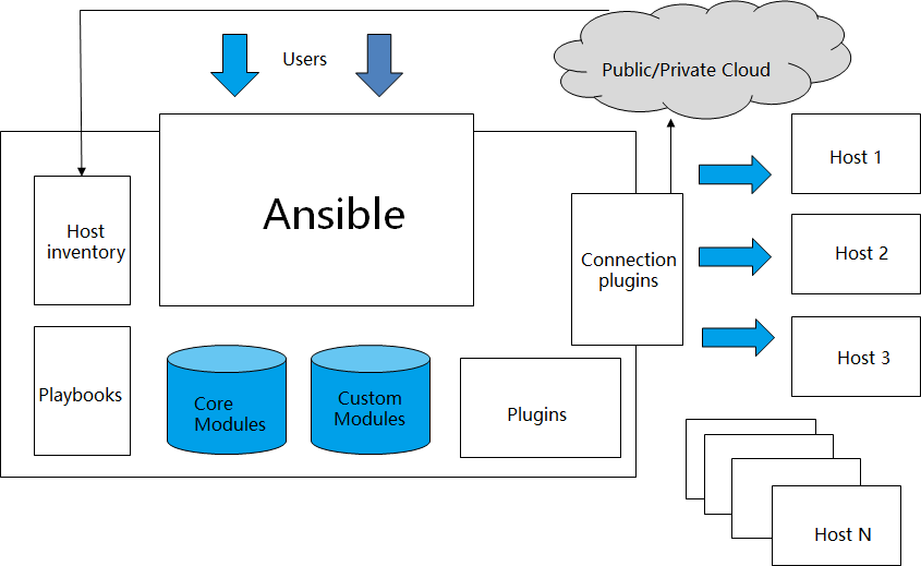 Ansible是一个由Python语言编写的,轻量级模块化的运维工具,这就意味着如果工程师对Python比较了解,就可以根据自己的需求来编写模块。模块是Ansible最小的运行单位,Ansible在部署时,无需在远程服务器上安装代理。通常的架构是一台主控机和若干台受控机,在工作时,由主控机下发指令至受控机执行。