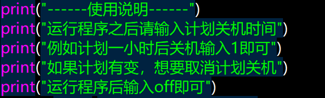 最后这一部分是当用户想要取消计划关机时所执行的命令,当用户输入“off”时,程序会取消之前的计划关机任务。