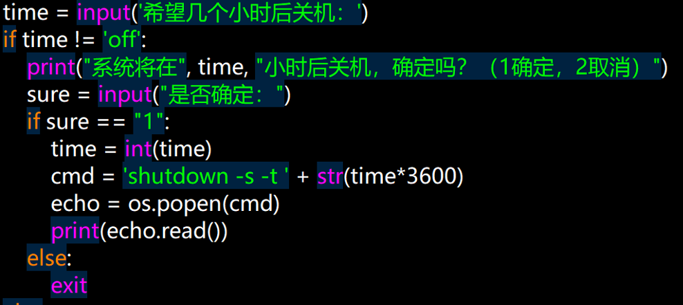 拿到用户输入的内容之后,便开始进行判断,首先判断用户是否要进行计划关机操作。如果是关机操作的话,会将用户的输入内容返回到屏幕上用来给用户做二次确认。同时也给用户一个纠错的选项。如果二次确认没问题,那么就开始进行一个计算,因为在Windows系统中shutdown命令后面的时间是按秒计算的,所以这里直接做一个乘法。最后将关机命令前缀“shutdown -s -t”与所得到的时间进行一个拼接,将拼接之后的字符串传递给os.popen来调用Windows系统命令执行该操作。以上说的是进行关机的操作,如果用户在二次确认时发现时间输入有误,则不会执行字符串拼接和时间计算的过程,直接退出程序。