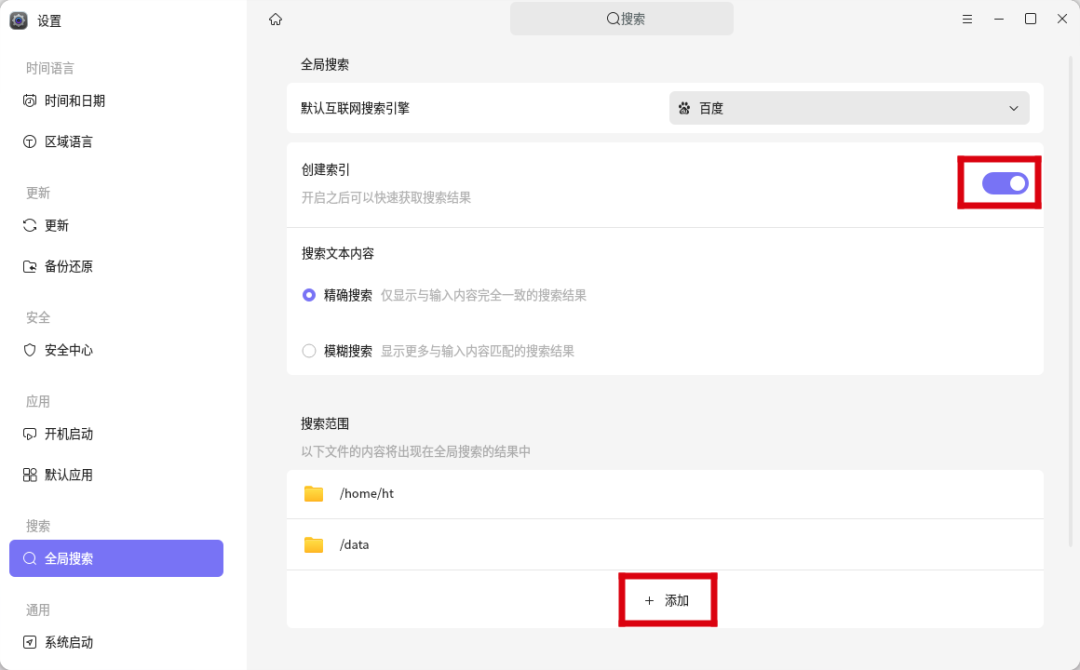 进入系统设置 - 搜索 - 全局搜索,打开创建索引开关,添加搜索范围。如下图所示: