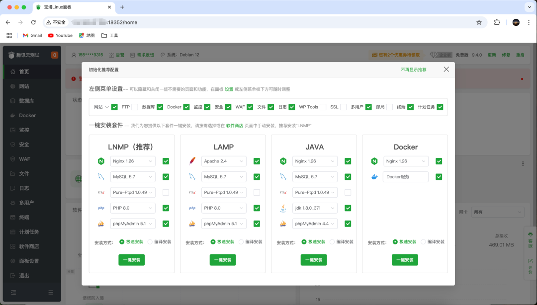 如项目没有特殊需要,通常推荐大家选择LNMP套件安装,生产环境建议大家使用编译安装,如无特殊必要,请不要安装FTP插件。(PS:编译安装MySQL对配置要求较高,如配置不足建议后期到软件商店单独安装MySQL)