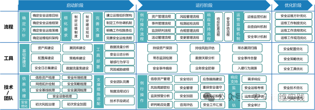 从整体角度考虑,安全运维框架落地包括启动阶段、运行阶段以及优化阶段。各阶段相互穿插,不同模块所在的阶段可能也不一致,因此不具备明确的时间线用来说明从什么时间开始算是启动阶段,从什么时间算是运行阶段,包括优化阶段也是在运行阶段中持续开展。因此个人理解整体流程更具备象征和参考意义。
