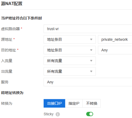 新建源NAT,将地址转换为“出接口IP”,打开Sticky