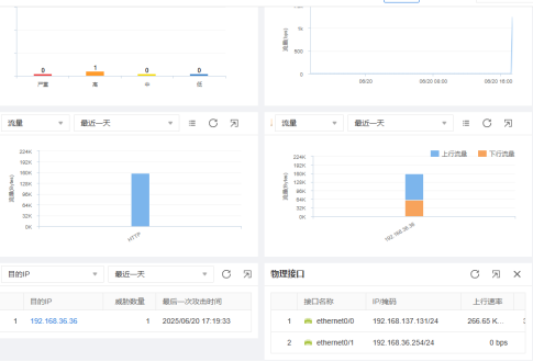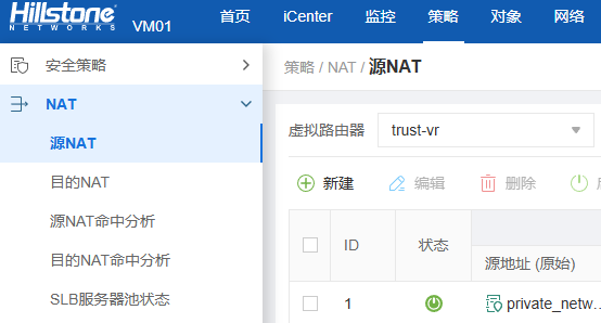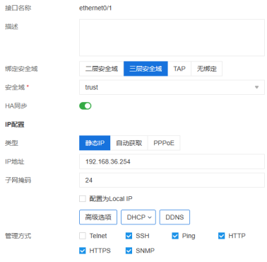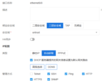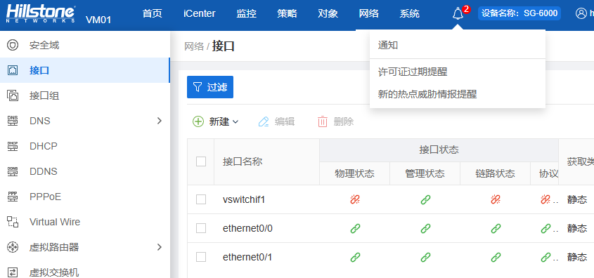 在顶上菜单中的网络-接口,修改ethernet0/0的安全域为:untrust,ethernet0/1的安全域:trust
