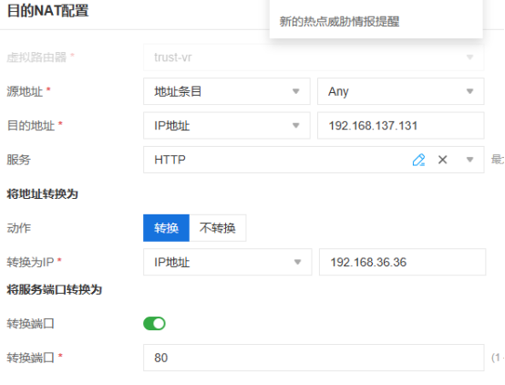 打开顶上菜单中的策略-NAT,在目的NAT添加高级配置,转换ip地址为UUWAF的ip地址