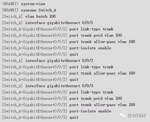 1、配置Switch_A的接口GE0/0/1~GE0/0/3都加入VLAN100(管理VLAN)。