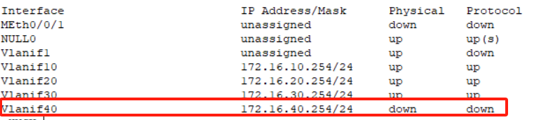 确实存在路由环路,造成环路的原因是核心交换机VLAN40故障无路由,再查看其VLANIF40和对应的物理接口状态: