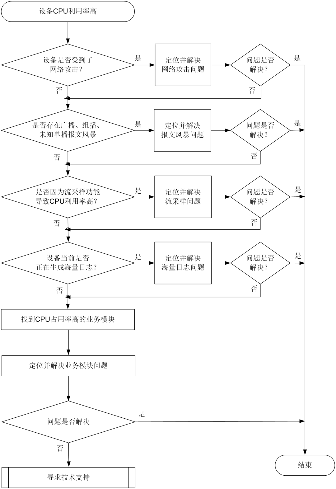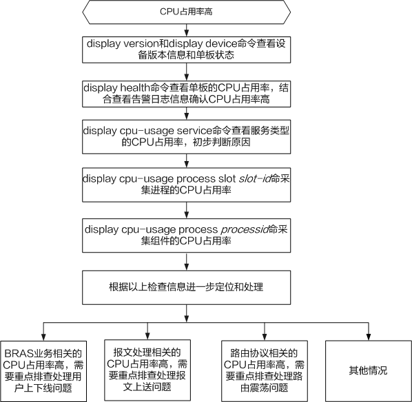 这里我给两张HUAWEI和H3C对于CPU飙高排障的标准流程图,大家可以参考一下:
