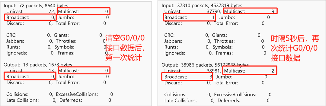 排查诊断:如上拓扑,因为路由器仅G0/0/0和G0/0/1口在用,看下是否有广播风暴或者广播&组播泛洪流进路由器CPU,我们只需要看这两个接口的数据统计即可,分别输入(统计前最好先输入reset counters interface清空接口数据统计):