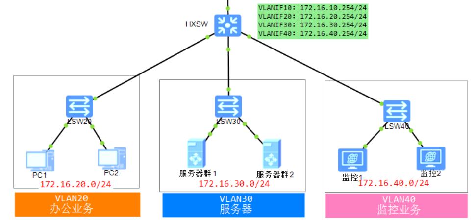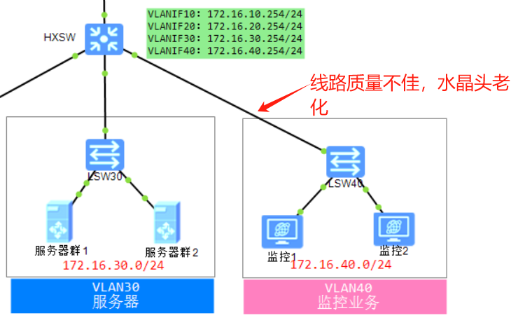 Re:原因是因为VLAN40是监控业务,它只需要VLAN40内部IPC、NVR互通就行,监控都在保安室里看着,没人会跨三层去访问这些监控设备,所以基本是无感知的。