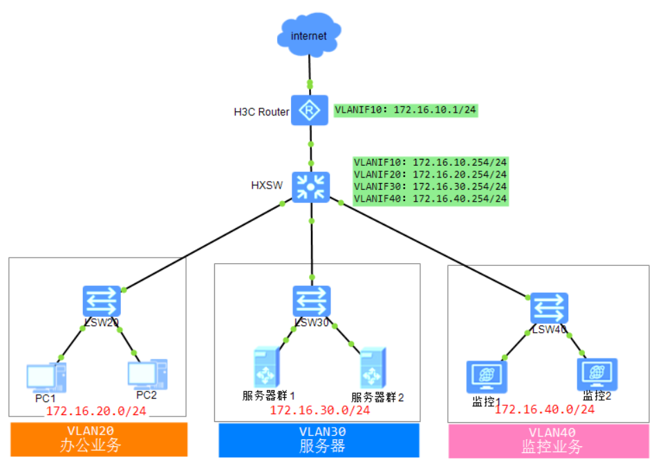 整套路由交换网络设备为H3C,出口路由对所有子网做NAPT实现上网需求。