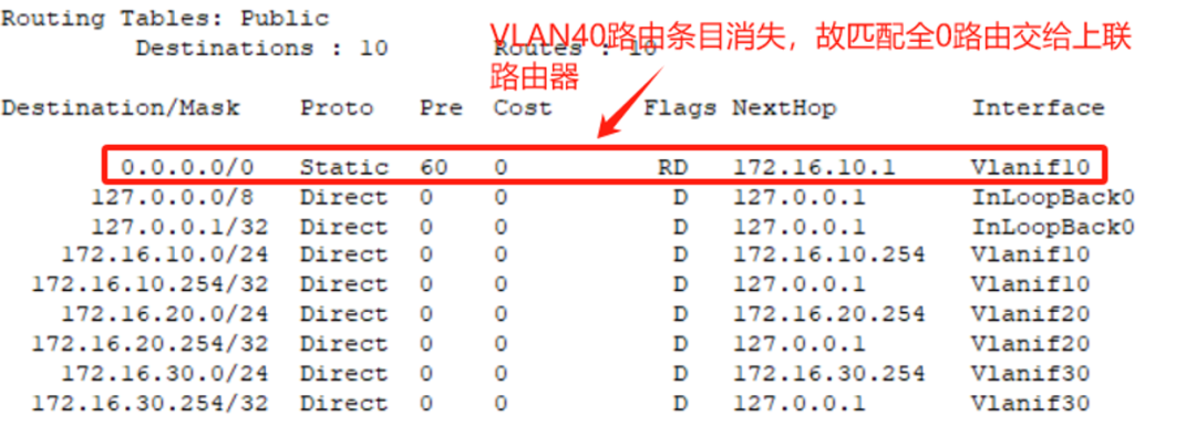 核心交换机上VLAN40所属的物理接口GE0/0/4状态为DOWN,所以VLANIF40消失了故没有生成对应的直连路由!