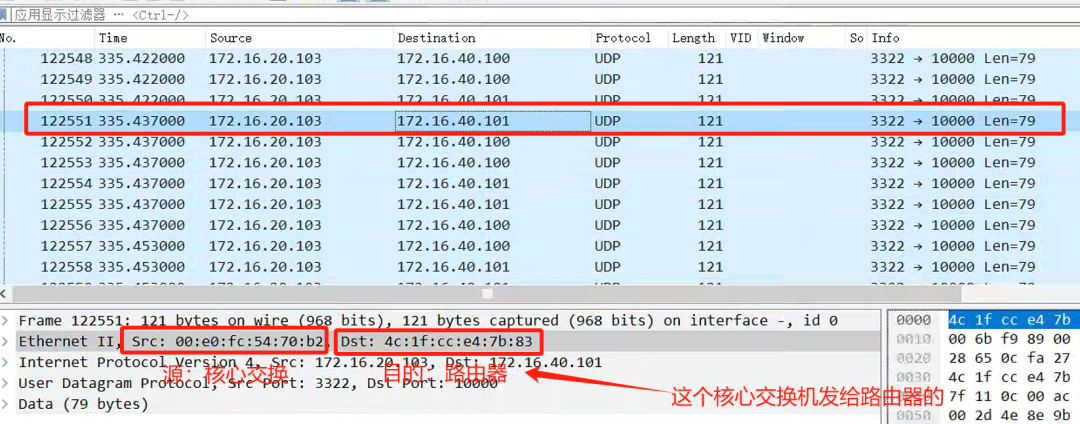 那么这条“异常流”为何会出现在核心交换与路由之间并且泛洪的呢?我们来看下数据包MAC地址对比一下: