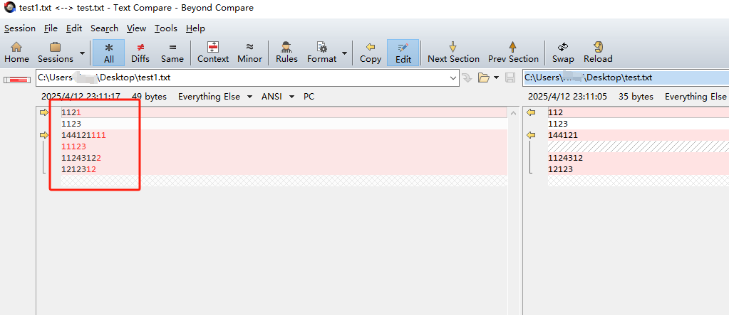Beyond Compare是一款非常好用的文本对比软件,小编经常用来割接的时候前后对比相关的参数信息是否一致,如路由表信息、arp信息、mac地址等。这样就能快速的看出缺少的部分路由等相关信息,方便我们排查问题。如下图所示,左右不一样的地方就会标红,方便我们查看。