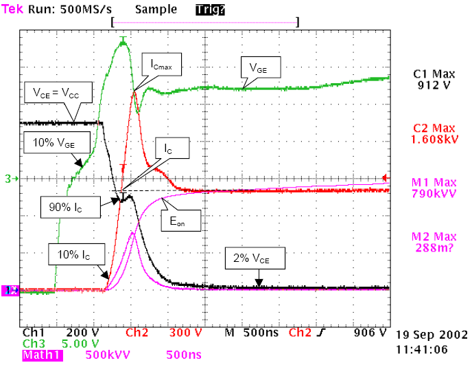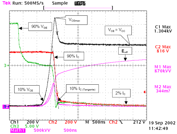 通过双脉冲测试,可以得到包括开关损耗,各电压电流尖峰值,斜率变化值在内的动态参数。比如IGBT参数: