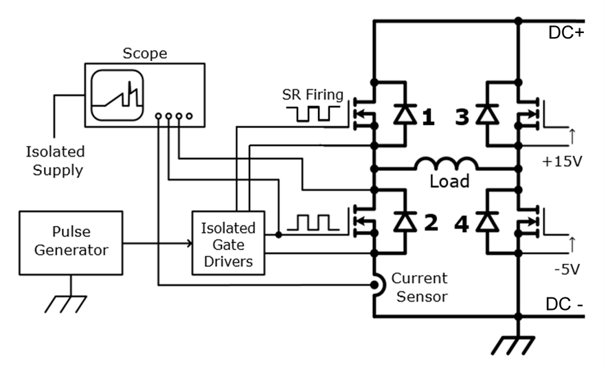 考虑到可能的电场干扰,最佳的双脉冲平台是全桥结构的,如图2所示。3管的门极给15V常开信号,4管则是处于常关,2管作为被测器件给予双脉冲信号。1管主要作用于续流,所以门极可以是常关信号,或者在使用MOS管时门极用同步整流信号。第1个脉冲来临时,电流经过3管和负载电感进入2管。为了得到一个期望的电流值,此脉冲需持续一定时长,时长可通过T=I*L/V来获得,其中L是负载电感值,I是期望电流,V是母线电压。当然实际中可以直接用示波器观察电流值来调整脉宽。
