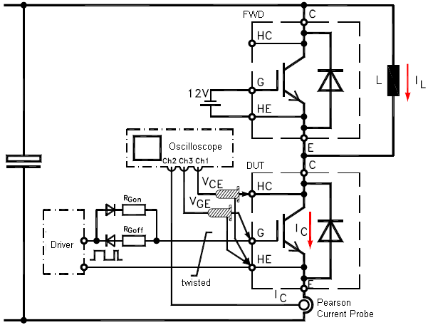 第一个脉冲结束时,2管关断,表现出器件的关断波形。此后,电流在3管、负载和1管中续流。当第2个脉冲到来时,2管开通,1管上的电流重新流入2管,这时可测量1管的反向恢复特性及2管的开通特性。其中电流的获取在小功率时可以采用电流检测电阻,而大电流时一般使用磁性电流检测器,比如罗氏线圈或者Pearson磁环。关于电压电流探头的使用之前有专门的文章详细介绍过: