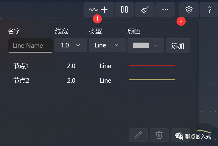 如下图在波形显示界面里点击图标 ①,添加与脚本语言里第 12 行和 13 行一致的两个波形名字,这里分别是“节点 1”和“节点 2”。在图标 ② 里可以设置坐标范围等参数,就可以显示波形了。