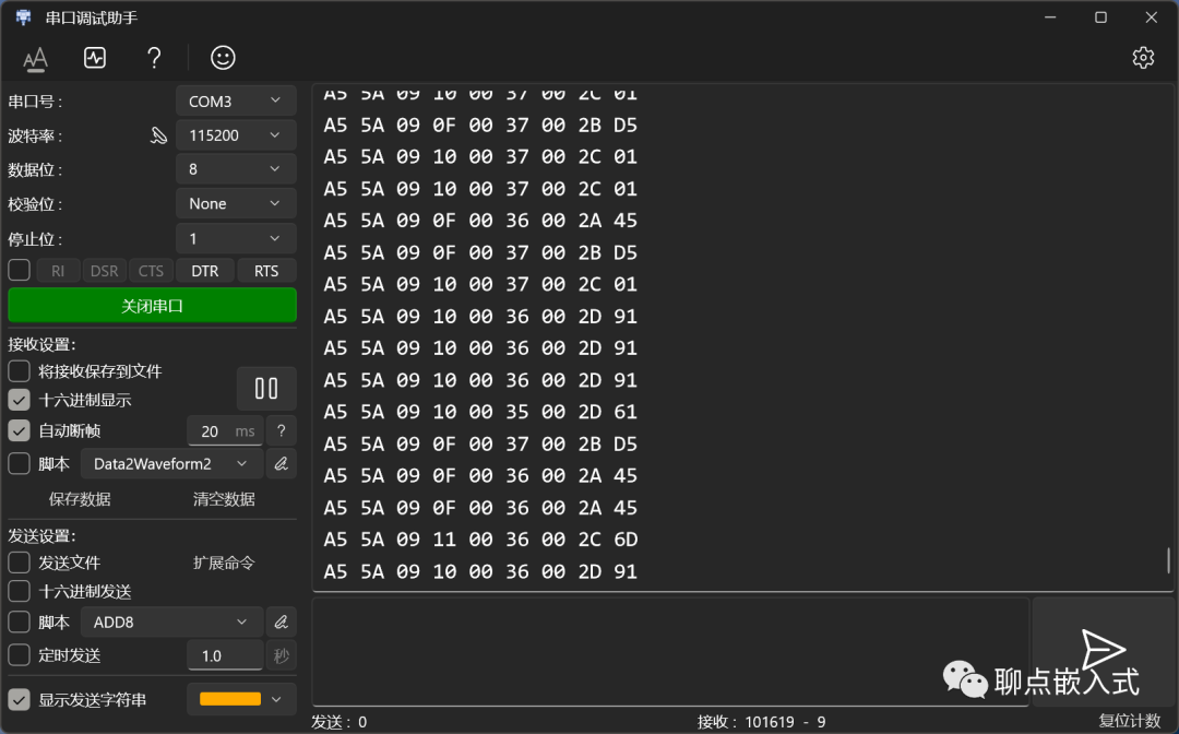 这次要介绍一款 Windows 端拓展性很强的串口调试工具——串口调试助手。这款串口调试工具已经在我的电脑上安装好几年了,一般只用到最基本的功能——从串口接收十六进制数据,很好用。今天在调试的时候觉得显示的十六进制数据实在是难以看明白,一是每个数据帧包含很多控制字节,二是数据十六进制显示,还要手动转十进制,三是多字节数据就更麻烦了,小端模式转换起来让人抓狂。决定花点时间尝试一下这个串口工具提供的高级功能,用 JS 脚本处理接收的数据再显示。