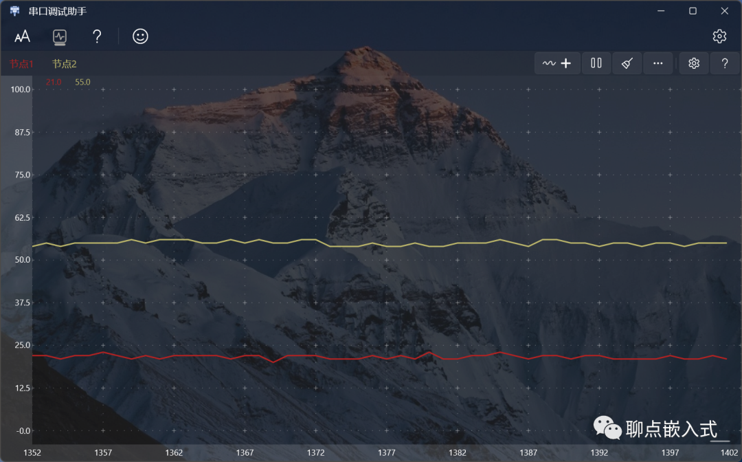 串口接收的原始数据在上图已经展示了,每帧数据共 9 个字节,前两个字节是帧头,第 3 个字节是帧长度,第 4 和第 5 字节是节点 1 数据,第 6 和第 7 字节是节点 2 数据,第 8 和第 9 字节是 CRC16 校验值。多字节数据按小端模式传输,低字节在前,高字节在后。