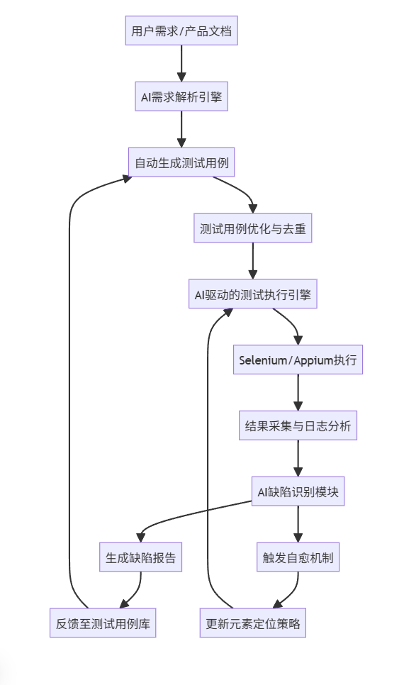明:该流程图展示了AI自动化测试框架的闭环系统。从需求输入开始,AI自动解析并生成测试用例,执行后通过AI分析结果,识别缺陷并反馈优化测试策略,形成持续学习与改进的闭环。