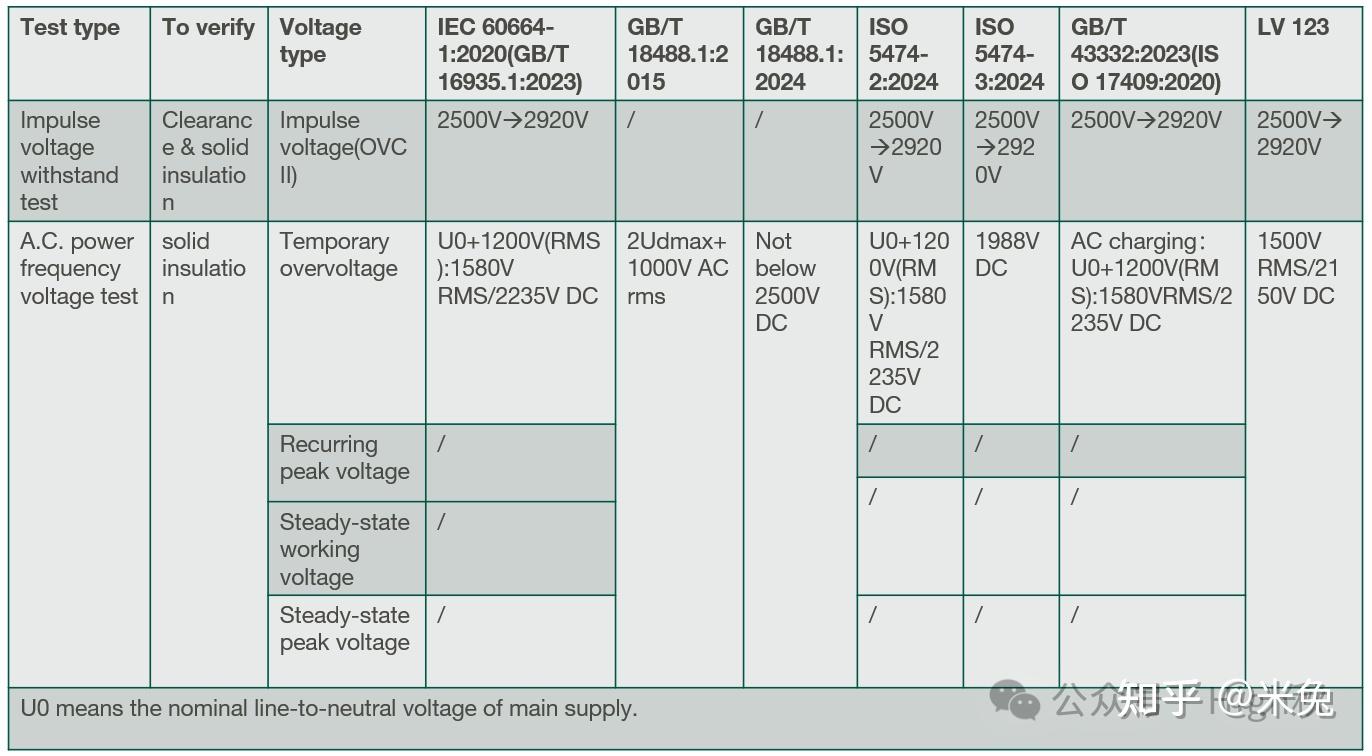 说完冲击电压,再来说下暂时过电压,这里的暂时过电压均指短期过电压,即持续时间<5s。暂时过电压的定义简单来说是当充电桩发生失效时产生的电压。这个时候就要注意了,交流充电桩和直流充电桩发生失效时产生的暂时过电压数值是不一样的,而且需要满足的法律法规是不一样的,我直接上结论:对于交流充电桩产生的暂时过电压为U+1200V RMS,这里的U指的是中性点接地的电源系统的标称线对中性点的电压,我理解对于中国电网来说是380V,如果我理解的不对,请大家帮忙指出。对于直流充电桩的暂时过电压数值,ISO 5474-3里明确定义是1988V DC。注意哦,现在提到的数值我们下面做对比的时候都会用到。