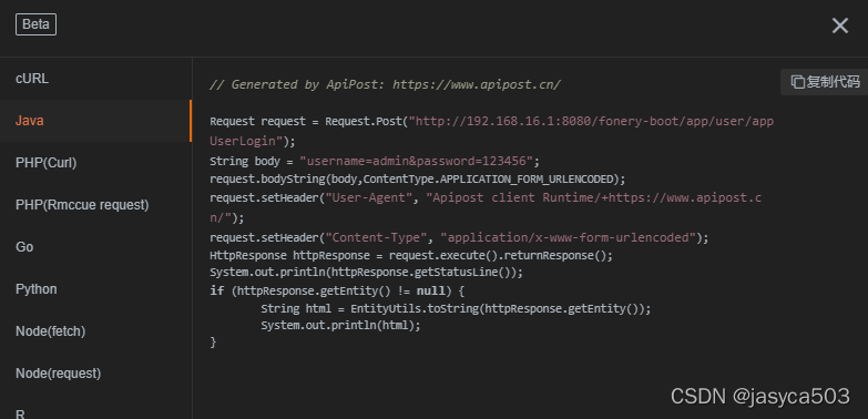 提供多达 10 多种语言以及各种 SDK 的 HTTP 请求代码,代码可以快速的集成到您的代码中: